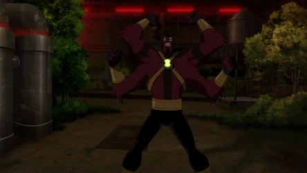 Four Arms is a Tetramand from the planet Khoros. He is a four-armed, built alien with four eyes. He is one of Ben's muscular aliens, like Humungousaur. He is red-skinned and has a ponytail. He wears gold gauntlets on his arms and wears long black pants with a gold belt. He wears the Ultimatrix symbol on his chest.